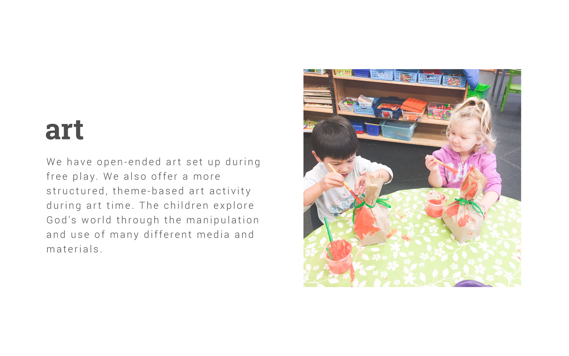 Tapestry Christian Early Learning is a group care that is licensed for a maximum of 24 children per session, ranging in age from thirty months to six years. We offer a play-based program that is Christ-centered. It is our belief that children learn naturally through play. Our preschool includes a variety of open ended activities which create various learning opportunities. Click the puzzle pieces below to find out more!